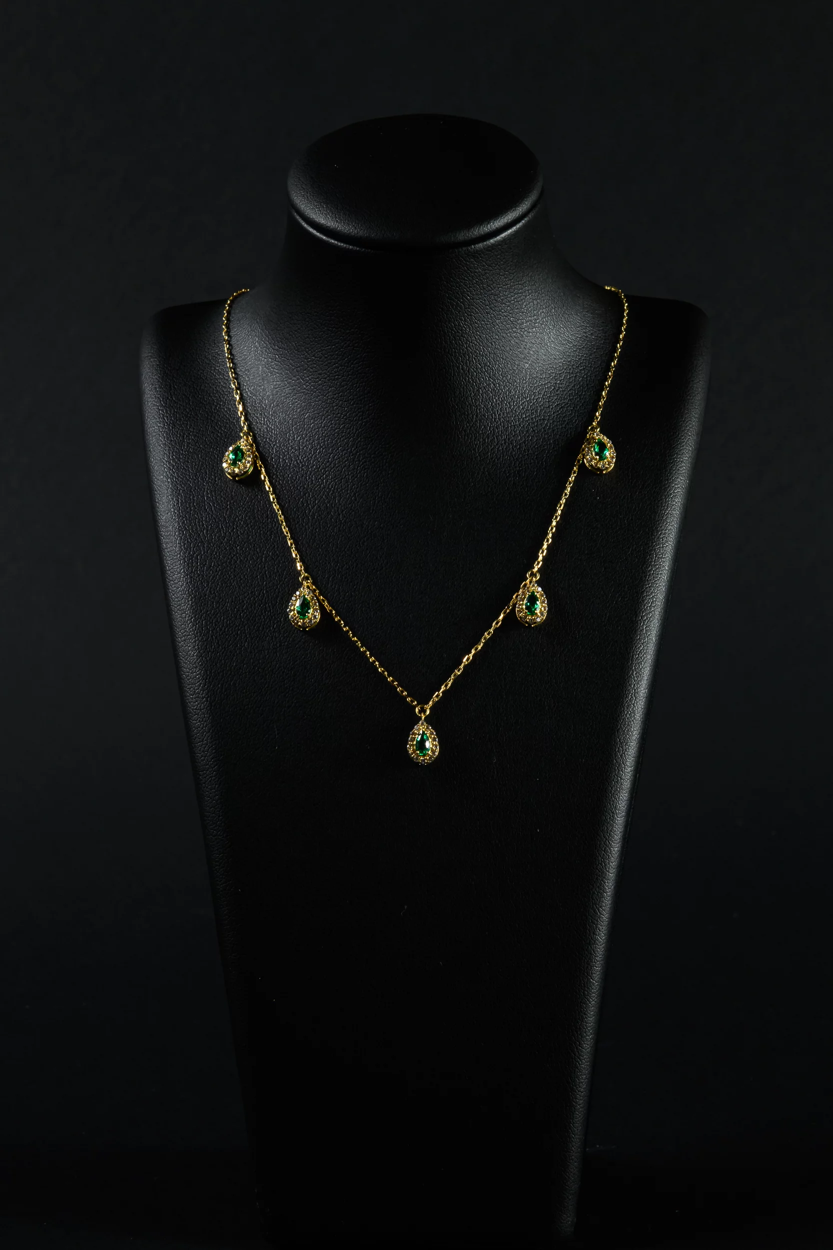 قلادة مميزة نقدم هذه القطعة اللامعة من المجوهرات بهذا التصميم الحديث للسلسلة الرفيعة من الذهب الأصفر عيار 18 قيراطًا مع الاحجار خضراء لامعة لإطلالة أنيقة وارستقراطية
